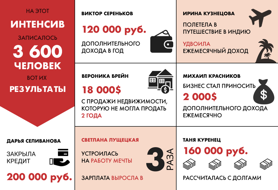 Так вот, на новой должности моя зарплата стала выше не на 15 процентов, как у других наших сотрудников, а на целых 45% Моя благодарность знаниям этого интенсива и масте-класса и восторг от результатов не имеют границ!